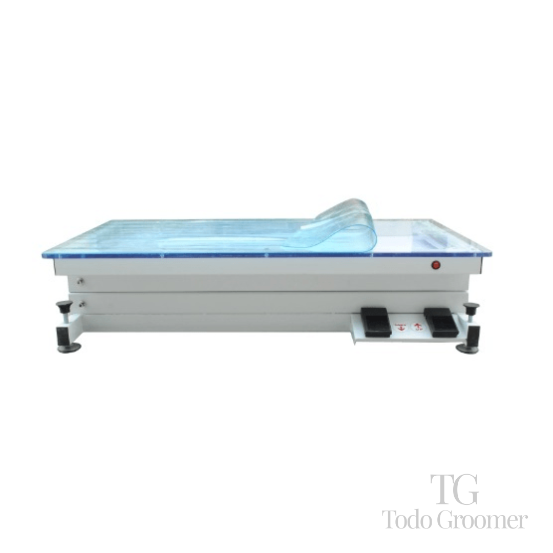 Con un sistema de elevación eléctrica de alta precisión, superficie acrílica iluminada y estructura de acero robusto, esta mesa ofrece una experiencia de grooming eficiente, segura y visualmente impactante.
