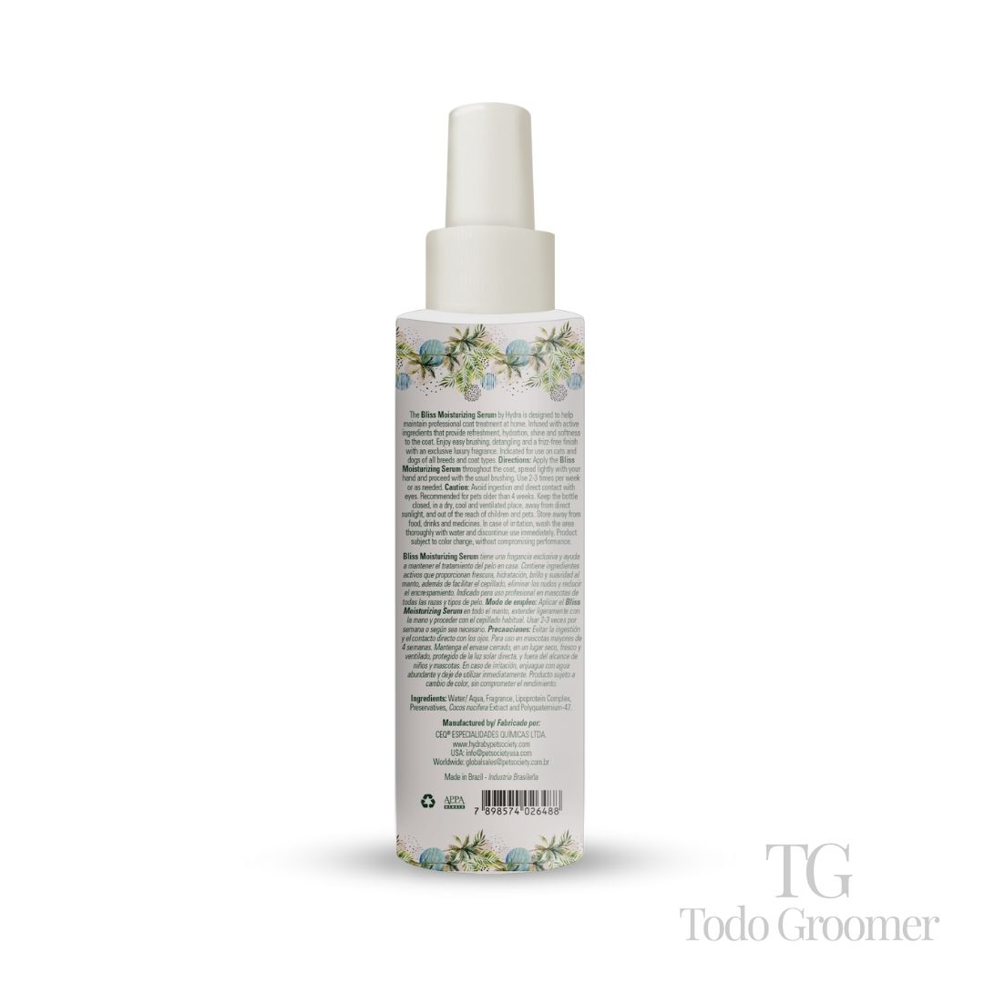 Senses Bliss Moisturizing Serum es un spray antiestático para cepillar y desodorizar. Perfecto para que los profesionales y los dueños de mascotas mantengan el pelo hidratado y saludable, estáticos y sin enredos.